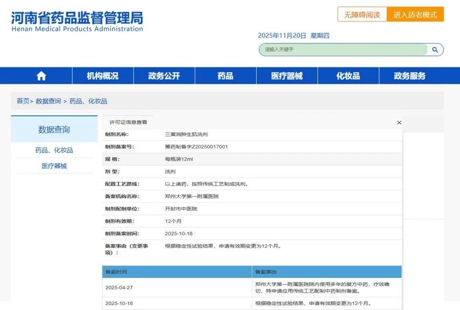 近日,由郑州大学第一附属医院中药科主任王娟带领团队自主研发的院内中药制剂——“三黄消肿生肌洗剂”,经相关部门严格审批,正式获批投入临床使用。这标志着郑州大学第一附属医院在中药制剂自主研发与成果转化领域实现重要突破,彰显该院中医药传承创新的坚实实力,将为广大皮肤相关疾病患者提供一种安全、高效、便捷的独具中医药特色的治疗新选择。